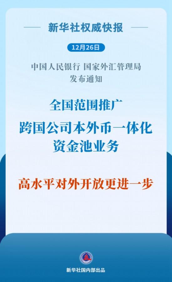 中国人民银行、国家外汇管理局12月26日发布通知,在总结前期部分地区试点经验的基础上,决定在全国范围内推广跨国公司本外币一体化资金池业务,并于发布之日起实施。