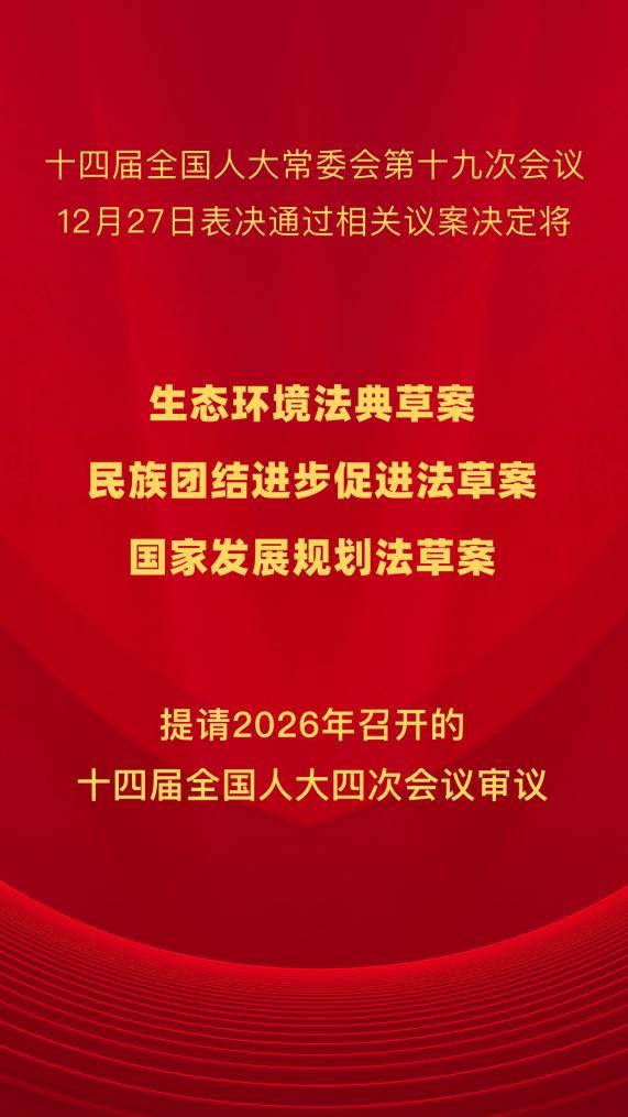 十四届全国人大常委会第十九次会议12月27日表决通过相关议案,决定将生态环境法典草案、民族团结进步促进法草案、国家发展规划法草案提请明年召开的十四届全国人大四次会议审议。