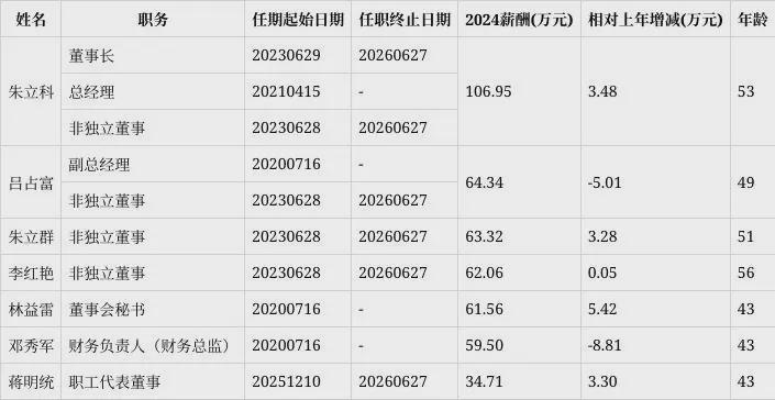 从薪酬看,董事和高级管理人员合计领取报酬452.44万元,平均薪酬69.62万元,年薪中位数为62.69万元。其中,董事长、总经理及非独立董事朱立科薪酬最高为106.95万元,财务负责人(财务总监)邓秀军薪酬最低为59.50万元(2024年任期不满1年的不参与统计)。