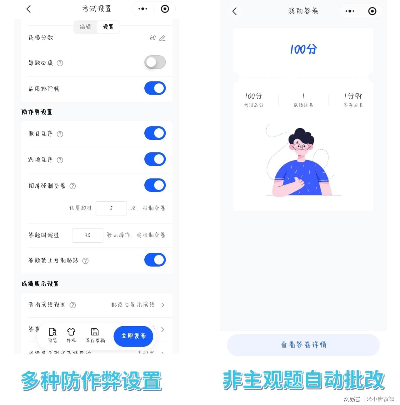 发布人能从题库选或套模板,1 分钟搞定 100 道题。内置题目乱序、选项乱序、切屏交卷等防作弊机制,保证考核真实;