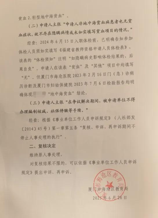 6月28日,海沧区教育局作出维持解聘的决定,其依据为《福建省教师资格申请人员体检标准》中“血液系统疾病不合格”的相关条款。局长孙民云表示,依据医生的上述诊断结果改变解聘决定比较牵强。厦门市纪检、教育、卫健系统多名相关人士透露,林芳被解聘的根源在于实名举报。