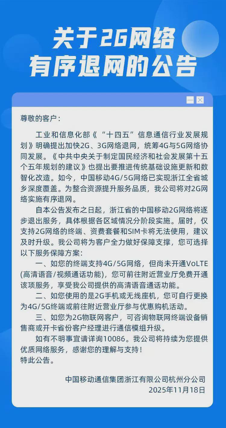 中国移动4G/5G网络已实现浙江全省城乡深度覆盖。浙江省的中国移动2G网络将逐步退出服务,具体根据各区域情况分阶段实施。
