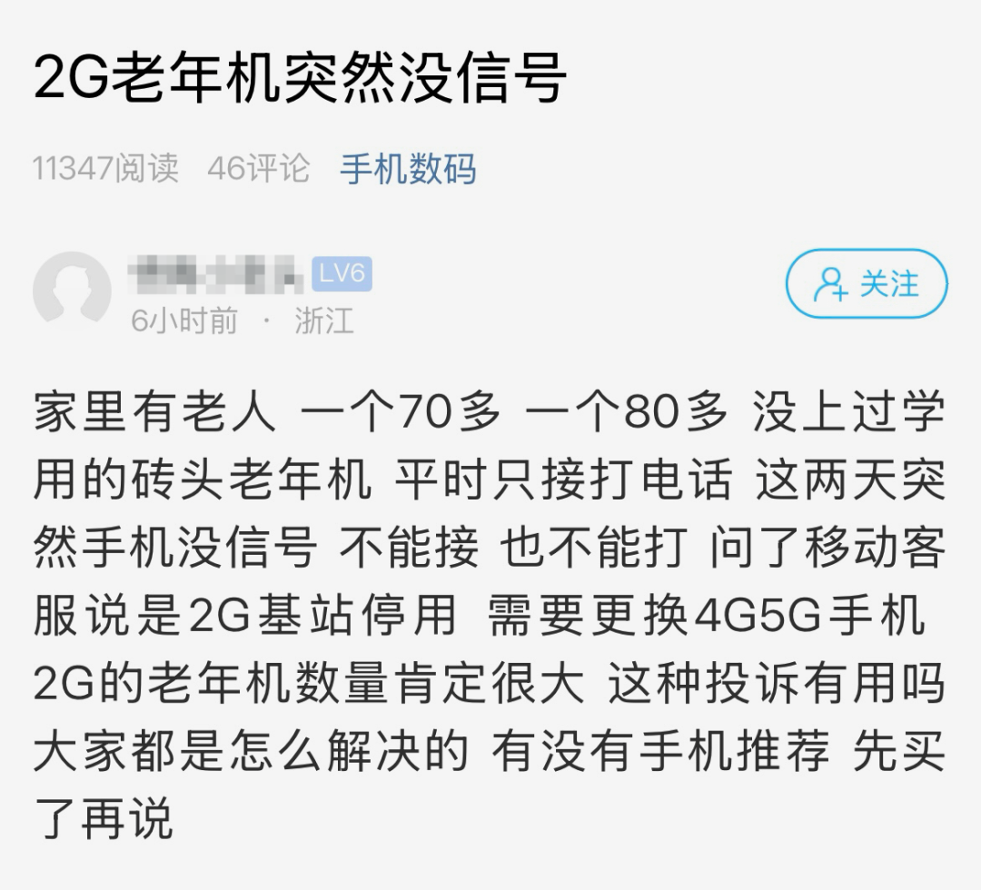 网友@筱筱杭:换卡,换机,没2G基站了。