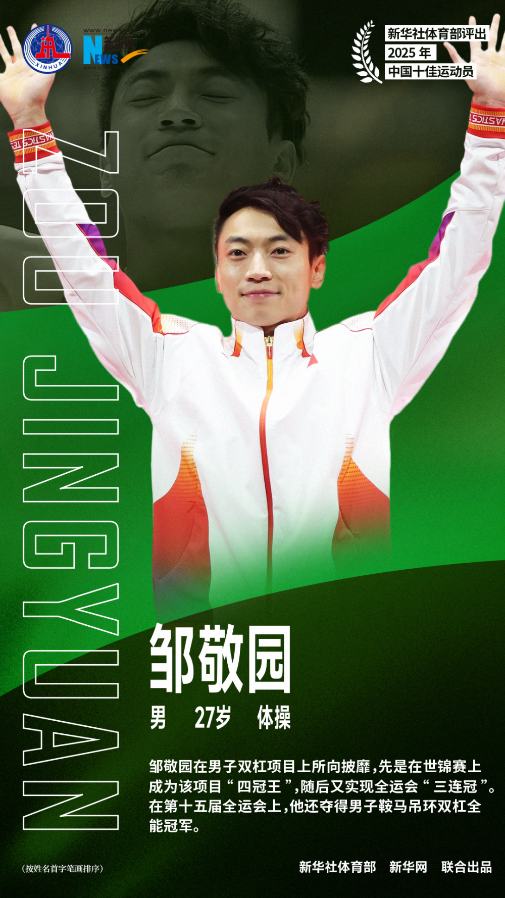 邹敬园在男子双杠项目上所向披靡,先是在世锦赛上成为该项目“四冠王”,随后又实现全运会“三连冠”。在第十五届全运会上,他还夺得男子鞍马吊环双杠全能冠军。