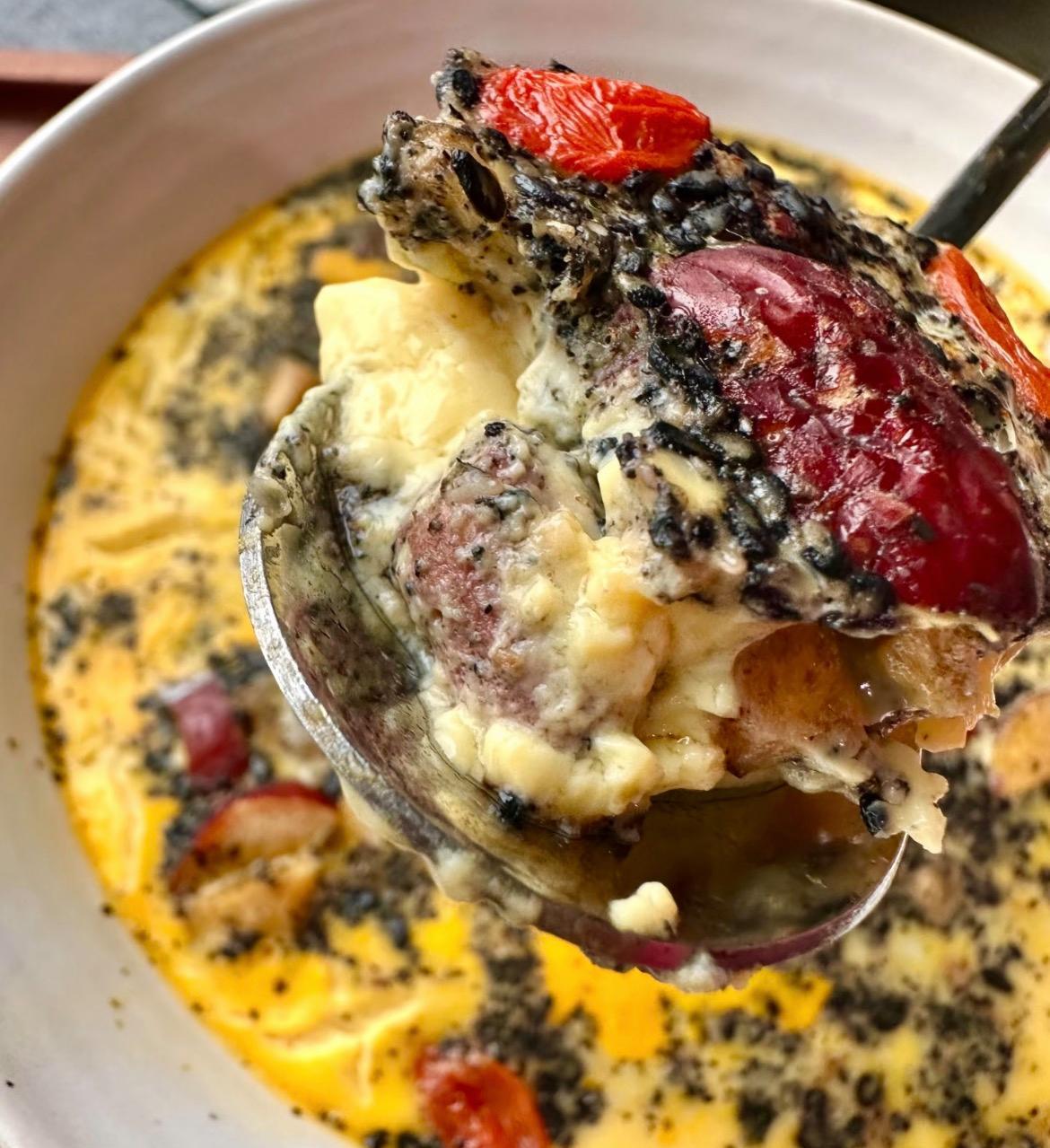 黑芝麻红枣碎蒸蛋也是我的心头好。鸡蛋打散,加点牛奶,嫩滑得像布丁。黑芝麻粉是自己炒熟磨的,香味足。核桃、花生稍微切碎,混进蛋液,上锅蒸十五分钟,快好时撒上枸杞,再焖两分钟。掀开盖子那一下,热气扑脸,满屋都是坚果和奶香。有一次我老公起得晚,坐那儿一勺接一勺,边吃边说:“这比你买的什么贵妇面膜管用。”
