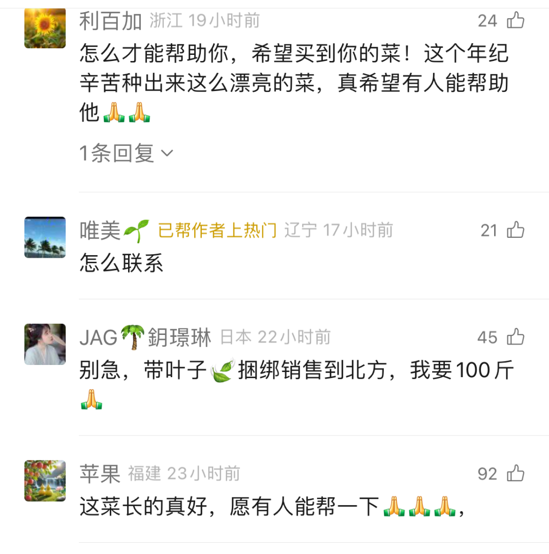 很快,一支由公益组织和村干部组成的志愿者队伍迅速集结,帮忙采摘、分拣和打包蔬菜。当地供销集团也加入了这场爱心助农行动。一份份订单从四面八方涌来,让可能烂在地里的蔬菜一下子有了活路。
