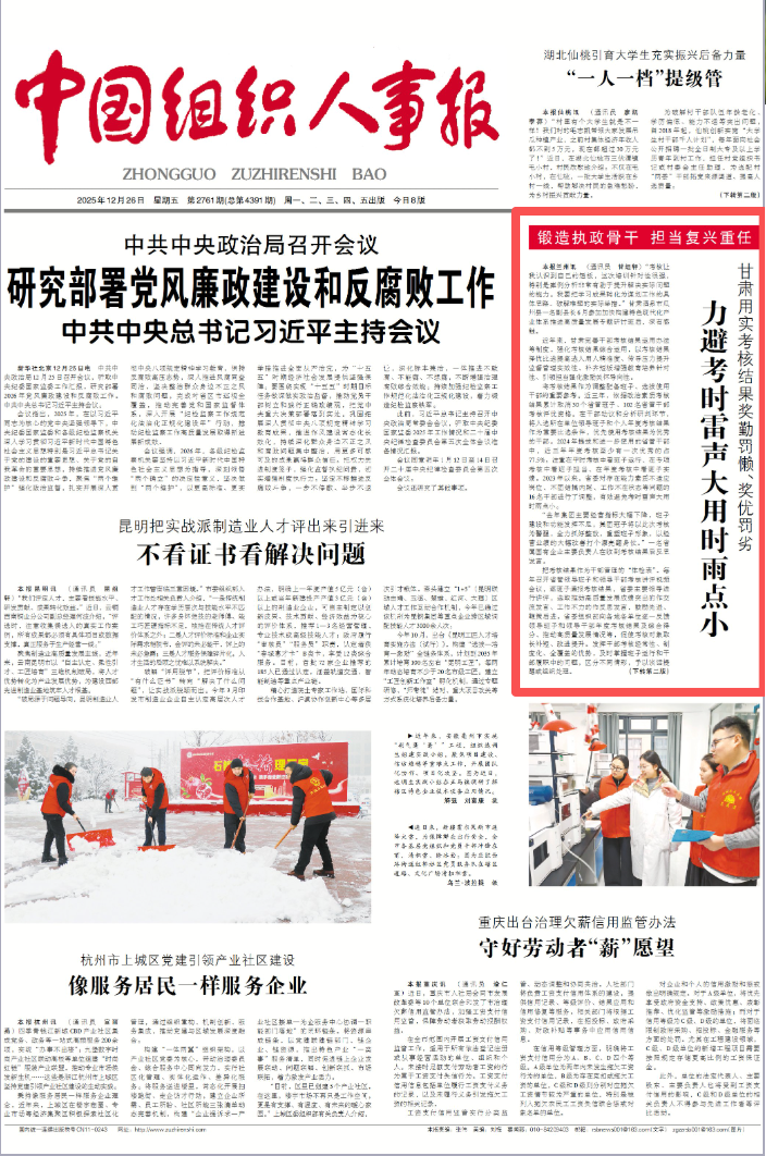 12月26日,《中国组织人事报》刊发文章《甘肃用实考核结果奖勤罚懒、奖优罚劣,力避考时雷声大用时雨点小》。