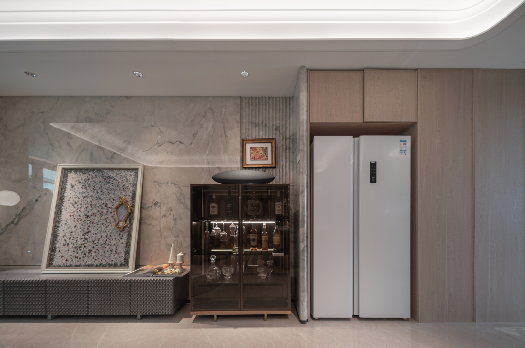 项目首层通过硬朗直线呼应柔和曲线勾勒,辅以温润石材与古铜色金属线条融合,打造东西方美学共融的艺术藏品