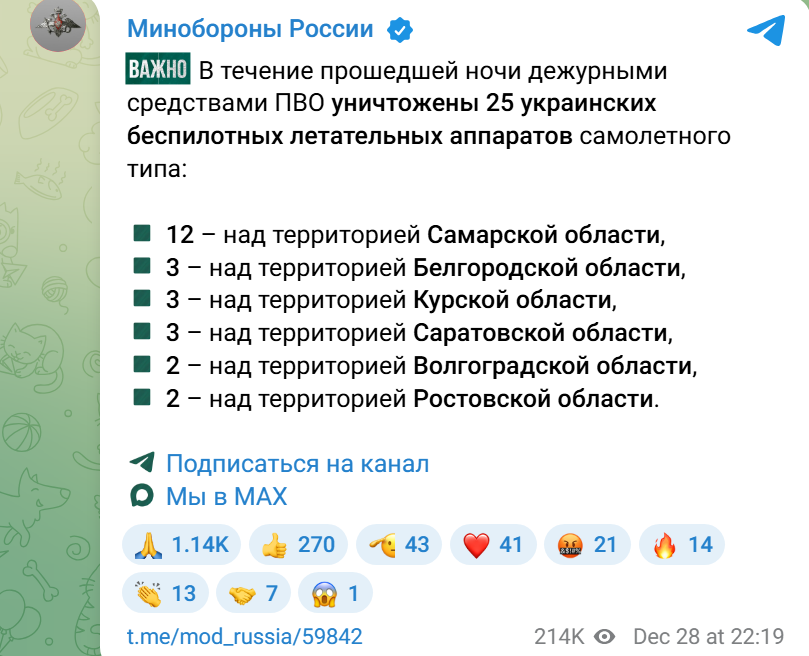12月28日晚,俄罗斯国防部在电报频道发布新闻稿称,乌克兰无人机在夜间袭击了俄罗斯六个地区,主要打击了南部萨马拉地区,防空系统拦截了25架无人机,其中在萨马拉地区击落了12架,在别尔哥罗德、库尔斯克和萨拉托夫各拦截了3架,在伏尔加格勒和罗斯托夫各拦截了2架。