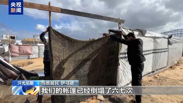当地居民 伊马德:正如你所看到的,这些帐篷全是木头和布料组成的。你可以拍一下这里,这些帐篷都是用布料搭建的。我们已经尽力了,只能忍受这样的生活。在两年多的战争中,我们都尽力去赚钱、搭建帐篷,但现在已经没有钱,也没有防水布去搭帐篷了。我们的帐篷已经倒塌了六七次,木头在水、潮湿的空气和沙子的作用下变得十分脆弱。我们现在什么都没有了。即使是最轻微的风,都可能让一切倒塌。
