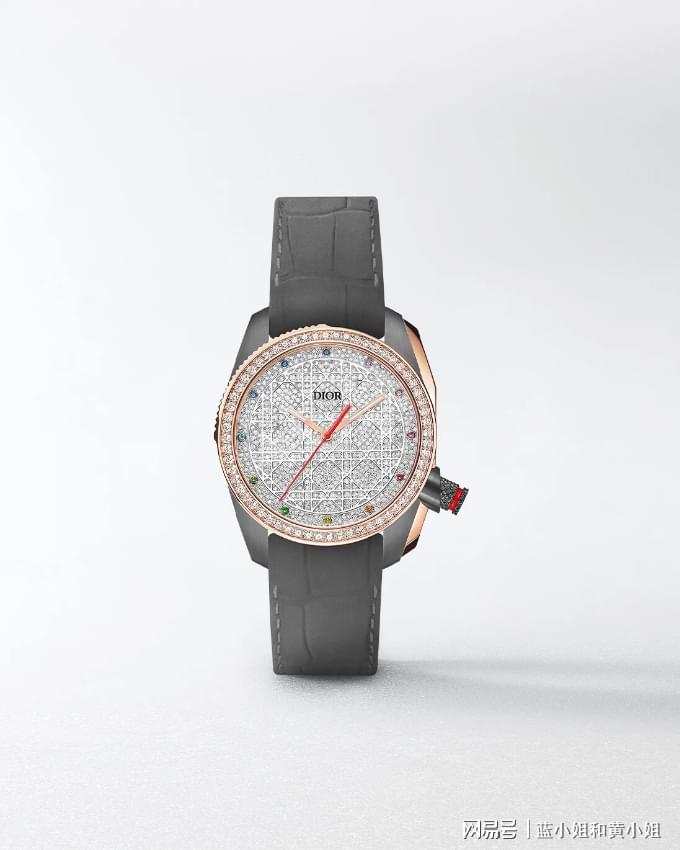 其中,38毫米款以纯灰色演绎,点缀标志性红色元素,设计简约凝练。表盘与可替换橡胶表带均镌刻同色调藤格纹图案,呼应品牌美学传统。该表款搭载精密自动机械装置,展现制表工坊的精湛妙艺;透明红色蓝宝石水晶底盖将机械之美——镌刻 “Dior” 标识与经典图案的摆陀展露无余。此外,该腕表亦推出41毫米计时码表款,并搭载计时精度达十分之一秒的机芯*。