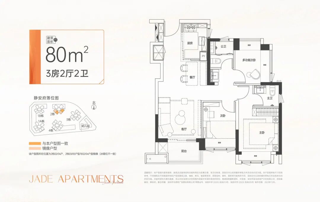 约80㎡三房2卫:创新LDKB户型设计,小户型三房两卫,三代同堂、两娃家庭上车首选;
