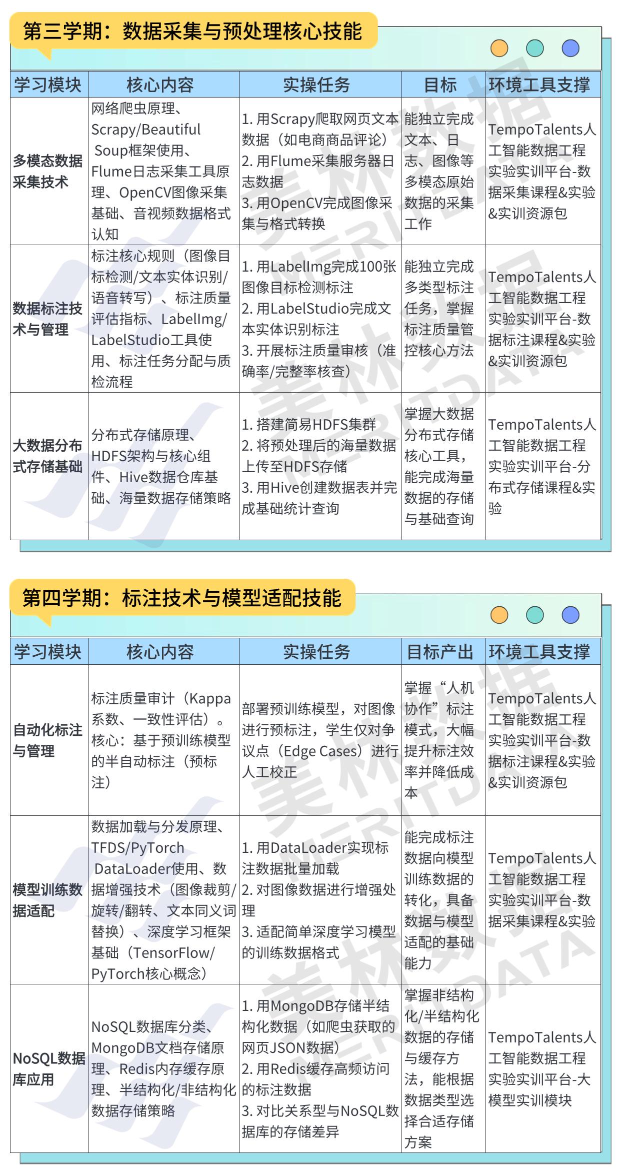 能独立完成“数据采集→预处理→存储→标注→训练适配→运维”全流程实施,具备项目实战落地能力,是本专业最核心的就业方向。