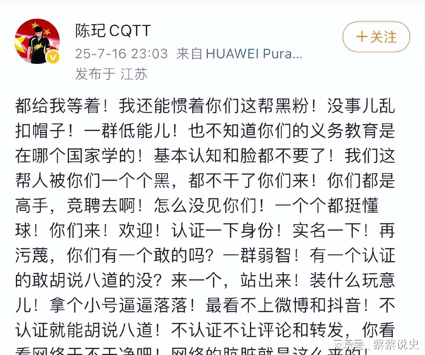陈玘的反击延续了他直来直去的风格,一句“你们都是高手,倒是竞聘去啊?”的反讽,直接点破了极端粉丝“外行指导内行”的荒谬。