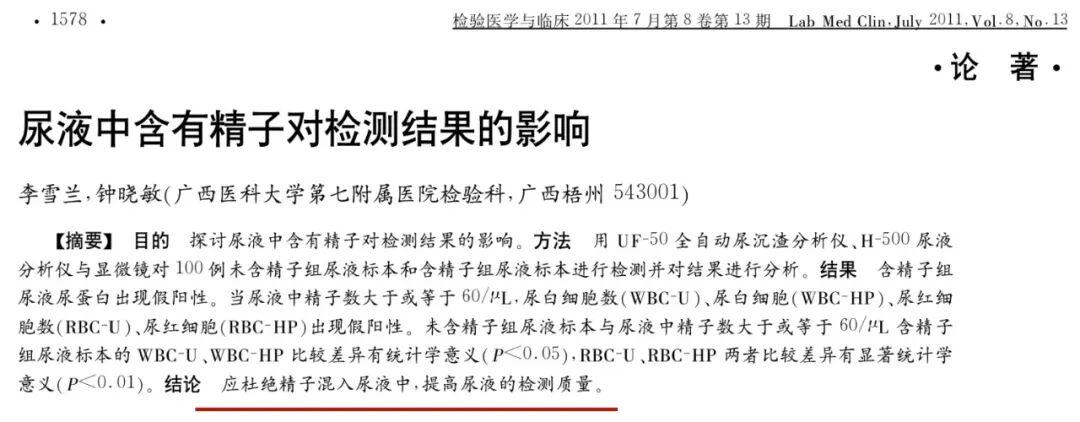 4.李雪兰,钟晓敏,.尿液中含有精子对检测结果的影响【J】.检验医学与临床,2011,(13):1578-1579.