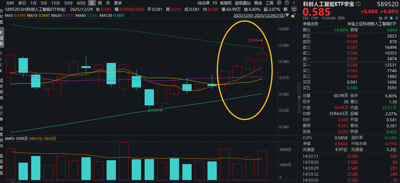 或由于芯原股份新签订单创历史单季度新高,算力芯片概念走强,重点布局国产AI产业链的科创人工智能ETF华宝(589520)场内涨幅最高上探2.07%,最终收涨0.69%,全天成交额3594万元,环比放量26%,成功斩获日线4连阳!