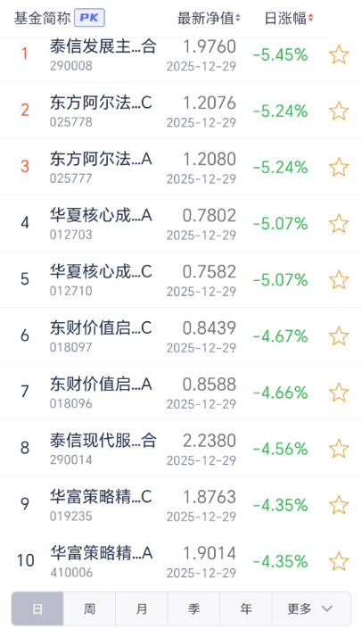 2025年12月29日开放式基金净值增长排名后10