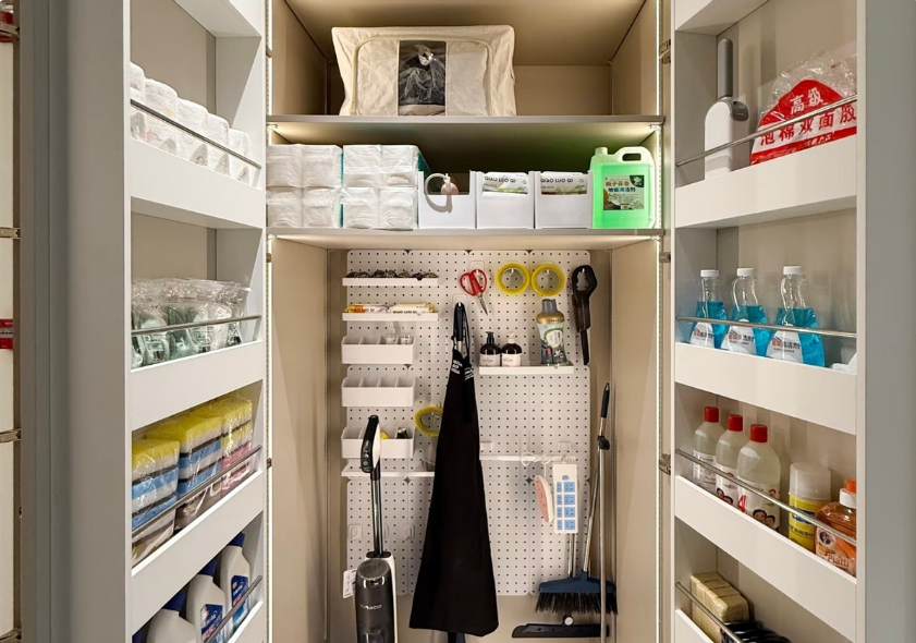 家政柜内部是固定的储物格,用来存放清洁剂囤货;中间层是一个可以拉出来的折叠区;而外侧却是一个可以翻转的收纳区,将整个柜子利用到了极致。