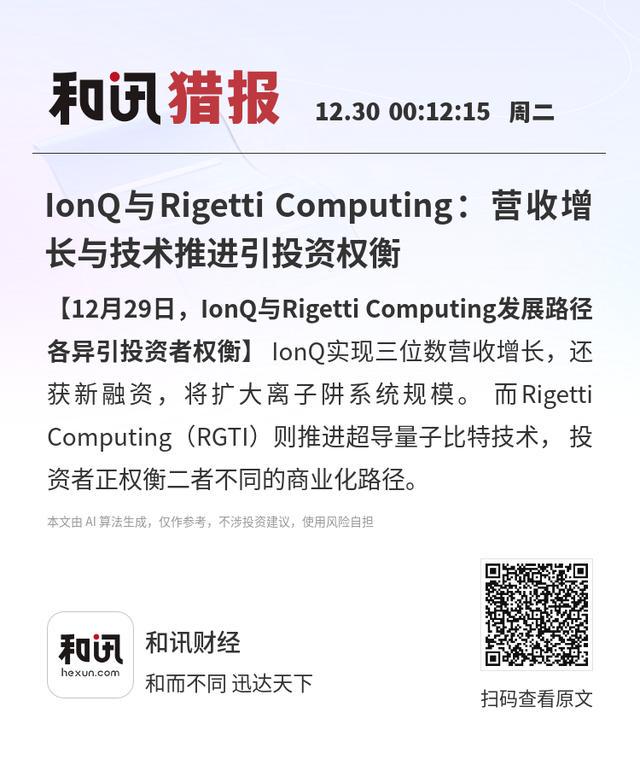 【12月29日,IonQ与Rigetti Computing发展路径各异引投资者权衡】IonQ实现三位数营收增长,还获新融资,将扩大离子阱系统规模。而Rigetti Computing(RGTI)则推进超导量子比特技术,投资者正权衡二者不同的商业化路径。