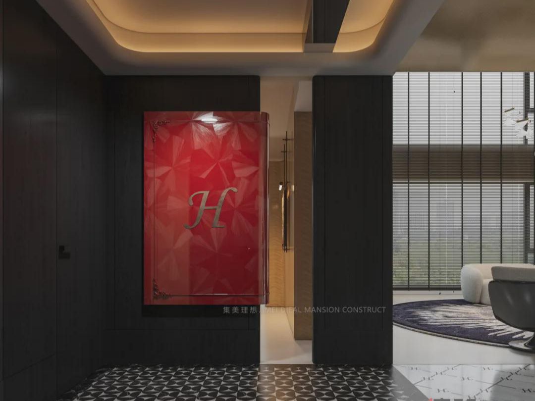 空间内用高饱和度的红色金属烤漆板,撞色深黑木质墙面,瞬间聚焦视觉重点。