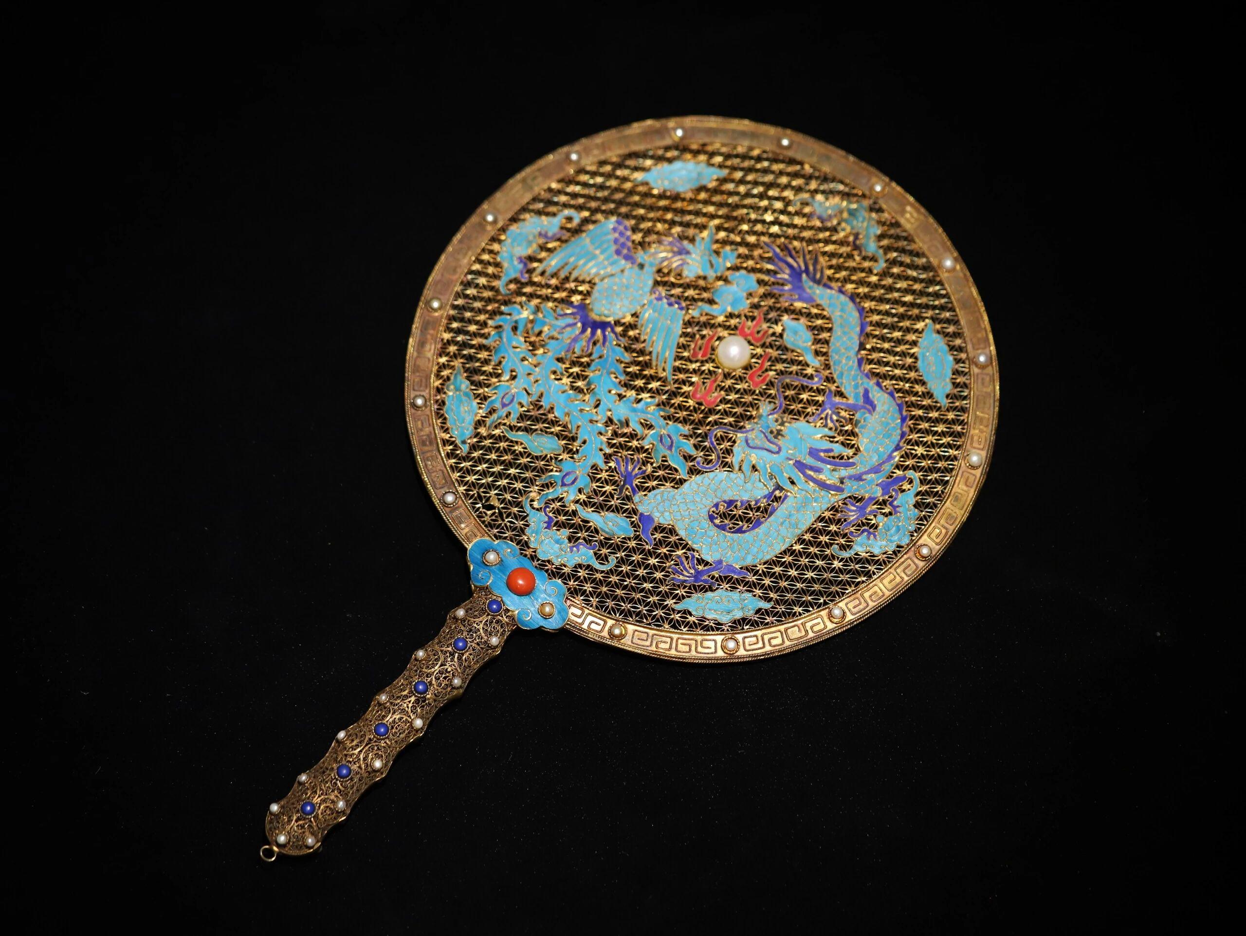 胎体为银鎏金,金水厚重且色泽莹润,通体镶嵌天然珍珠、红珊瑚、青金石等名贵宝石,主纹中心嵌一颗大颗珍珠为“火珠”,扇柄与扇面连接处嵌红珊瑚圆珠,扇柄花丝间点缀青金石与小珍珠,宝石选材精良、镶嵌牢固。-采用花丝工艺打造扇面基底:以细金丝编织出几何网格纹,工艺细密如织,展现了清代宫廷花丝“细若毫发、巧夺天工”的水准;扇面主体以点翠工艺雕琢龙凤呈祥纹,翠羽色泽艳蓝,龙凤体态矫健、鳞羽刻画精细,祥云纹环绕衬托,尽显皇家纹饰的威严与华丽