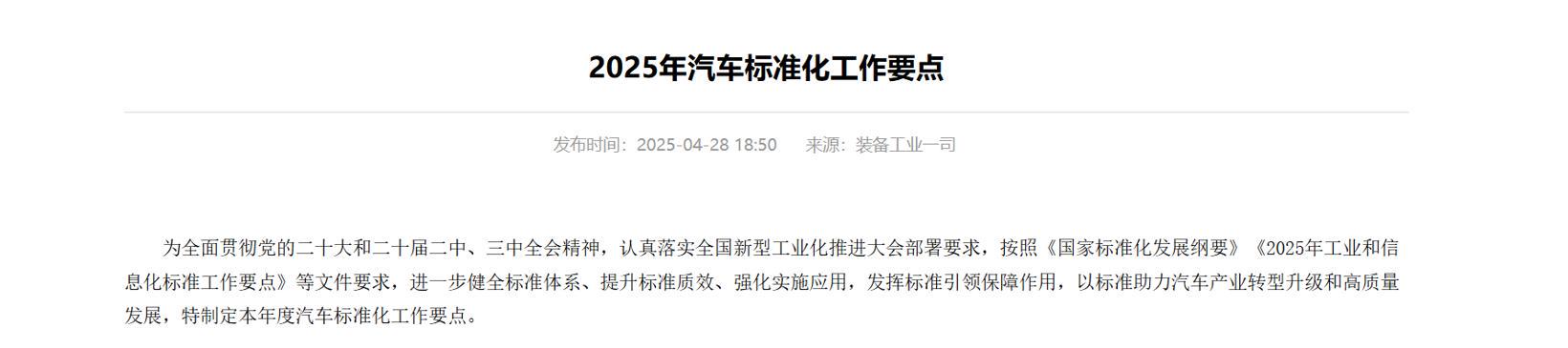 《2025年汽车标准化工作要点》由工业和信息化部于2025年4月28日发布,如果把中国汽车产业比作一列高速列车,那这份工作要点,就是为它铺设的“标准化轨道”,在该工作要点中,系统阐述了2025年度汽车标准化工作要点。