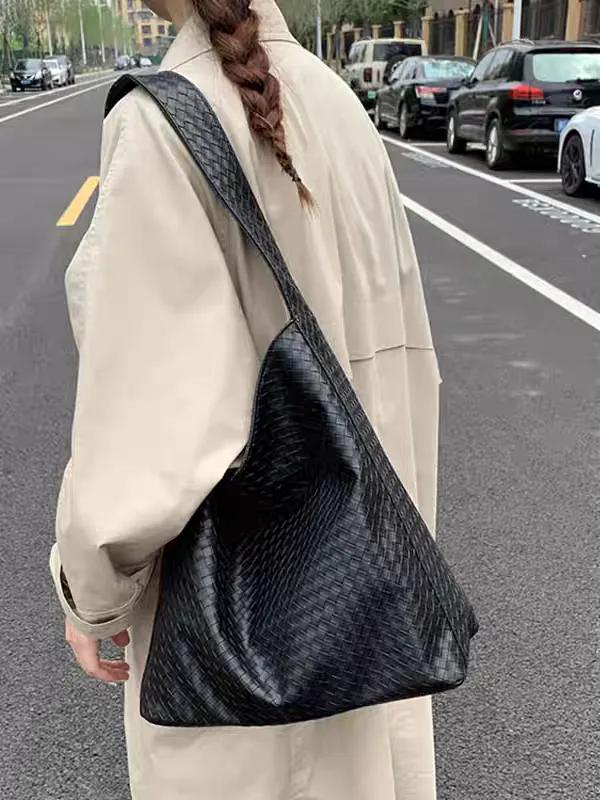 而笙观相沐复古编织托特包通过精准的压纹工艺,将平整的PU皮料压制成立体、均匀的仿手工编织纹理