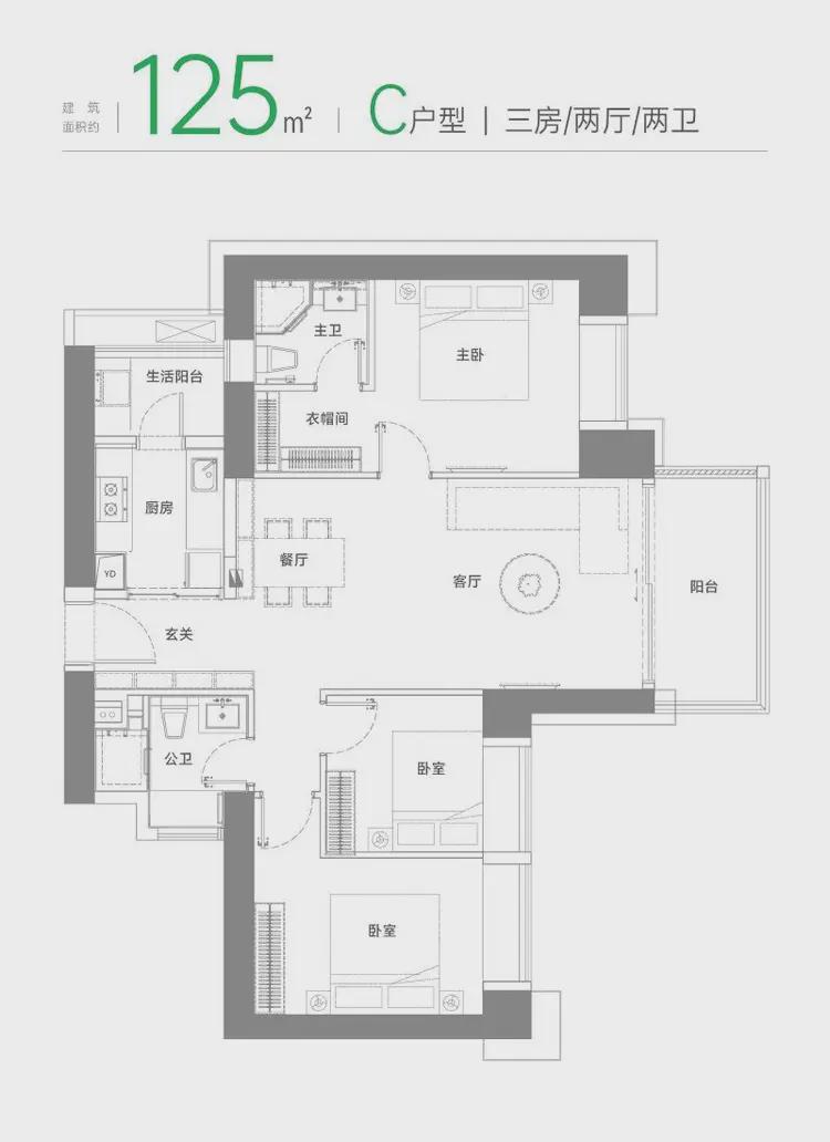 ③ 125㎡3房2卫:809套(A户型646套+B户型99套+C户型64套)