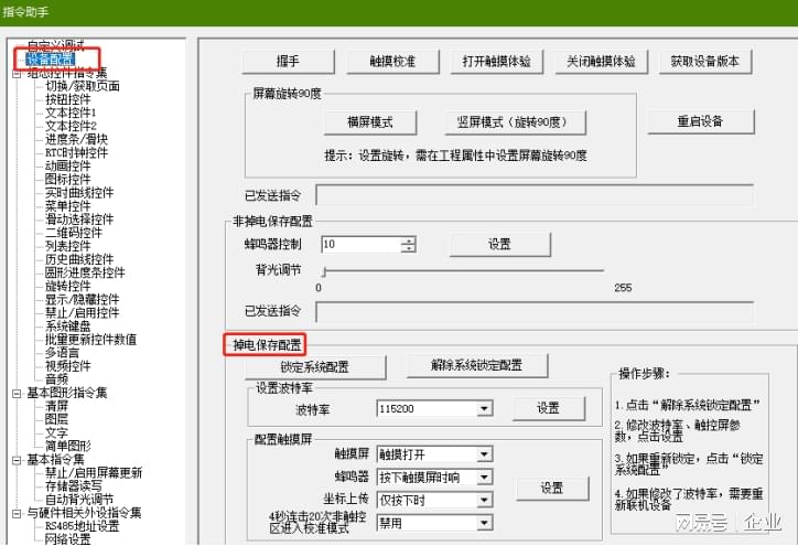 1. 打开HMIDesigner软件中的“指令助手”模块,在功能列表中选中“设备配置”选项,进入波特率配置界面。