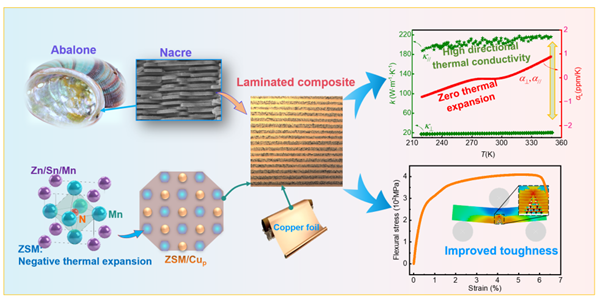 ▲ 图 1. 仿贝壳结构的叠层铜基复合材料及其零膨胀特性、单向高热导率和强韧性