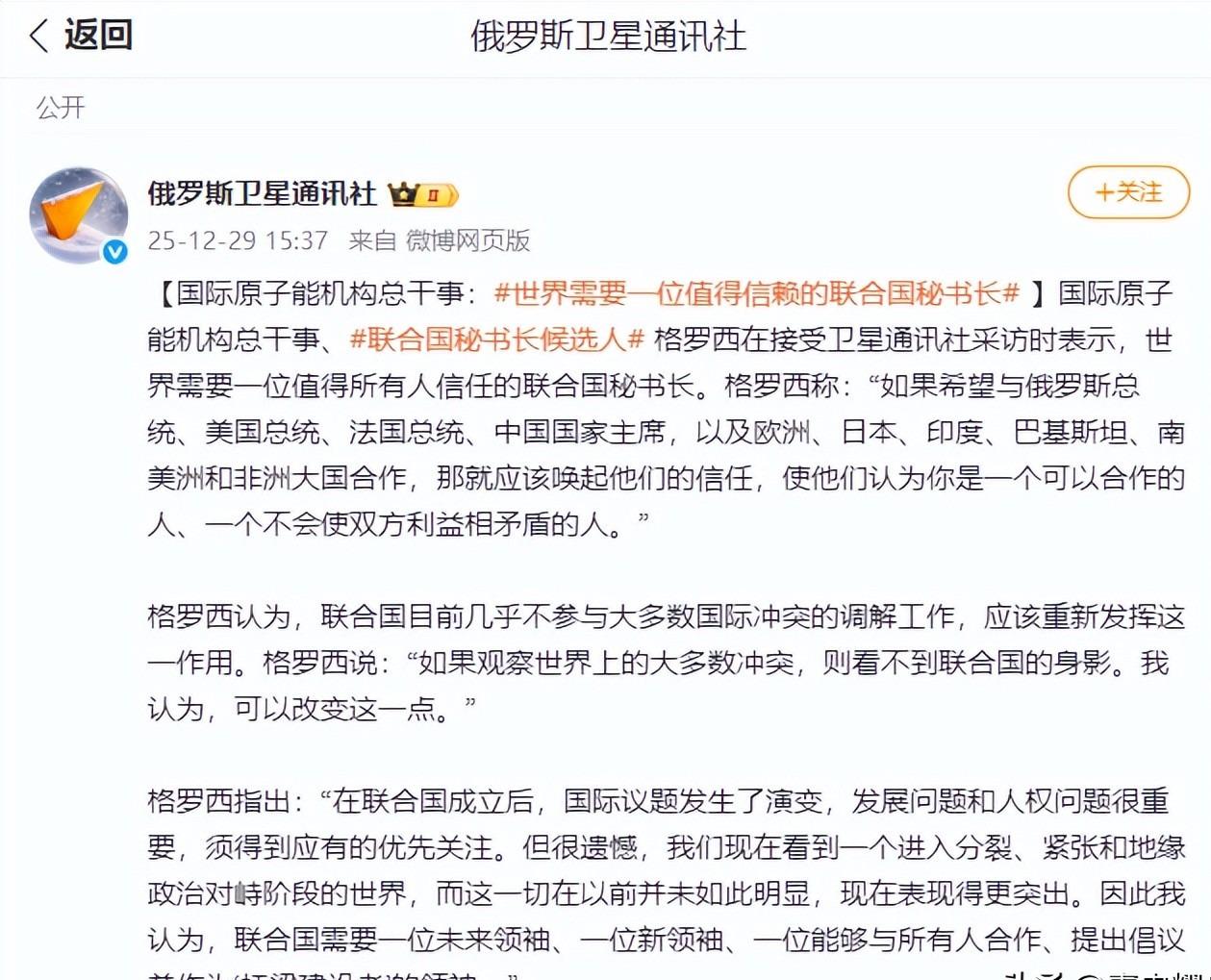 更关键的是,他把“争取大国信任”放在了核心位置。要知道,联合国要想发挥作用,离开中俄美法这些大国的支持根本无从谈起。格罗西明确表态,要做一个“不会让双方利益相矛盾”的合作者,要当“桥梁建设者”,这个定位可以说是踩在了点子上。