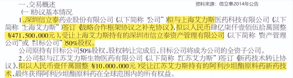 新药研发成功的艾力斯,并未选择自己卖产品,而是通过股权+技术转让的组合方式,向信立泰出让阿利沙坦酯相关权益。交易分两次进行,一次在2012年10月,金额约3.38亿,另一次在2014年11月,金额约4.81亿,两次交易艾力斯累计获得约8.2亿资金。