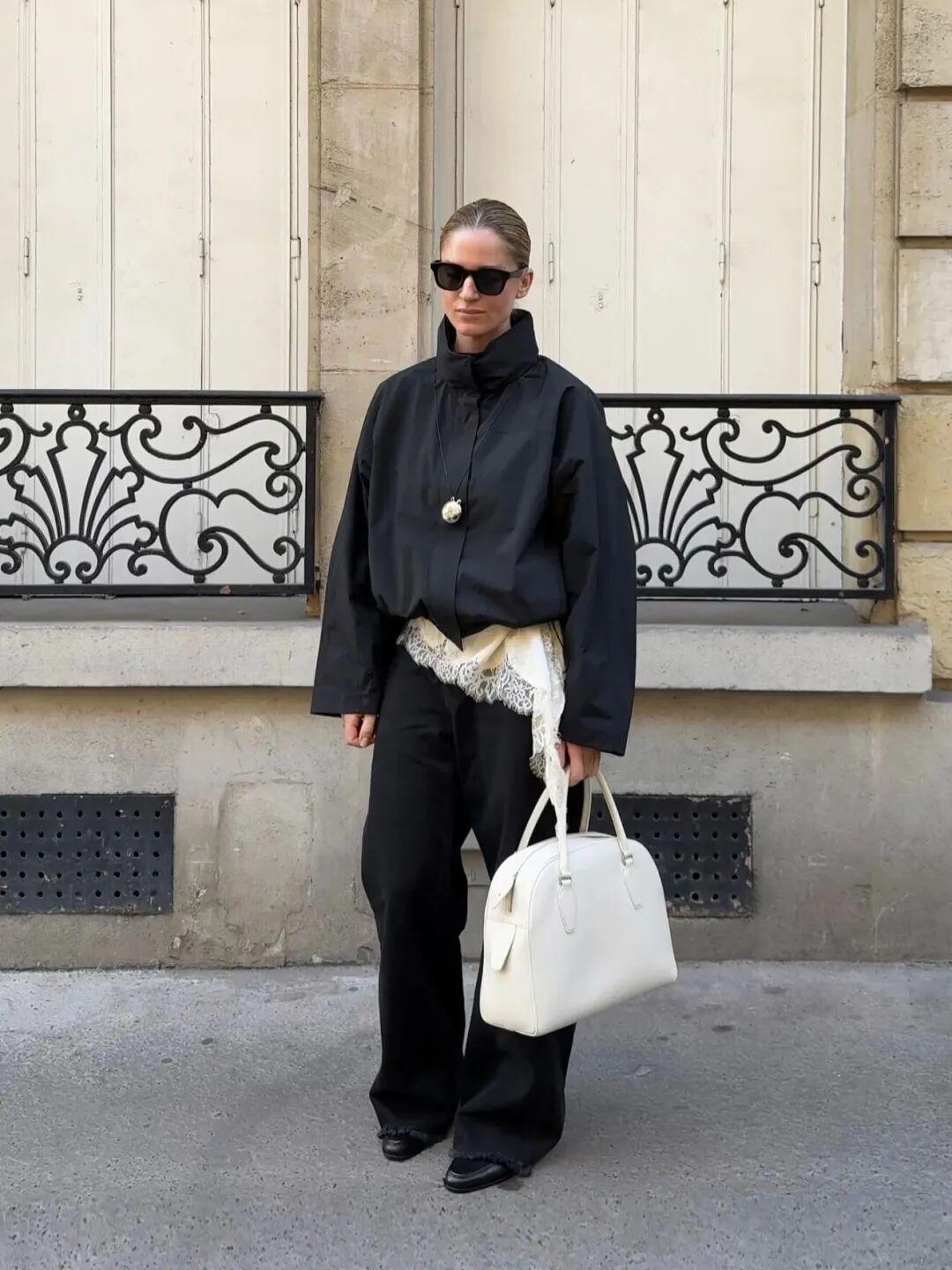 穿着时,一定要让领口成为造型的焦点。搭配柔滑或富有垂感的单品,能中和外套的挺度,让整体更松弛。