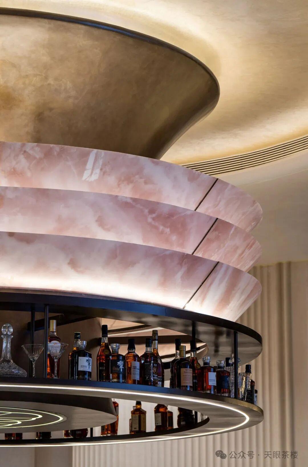 历经匠人反复的打磨工序,呈现大尺度带纹理的透光云石,内置柔和暖调灯光,远观如飘散的墨迹,增添雅趣。