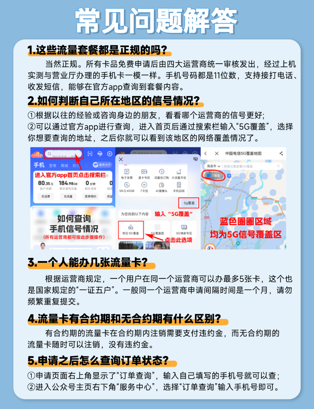 关注下方卡片,进入主页右下角点击“订单查询”,输入申请时填写的号码即可查询订单状态;点击右下角“专属客服”,有任何疑问均可留言咨询,神卡局专属客服实时在线解答。