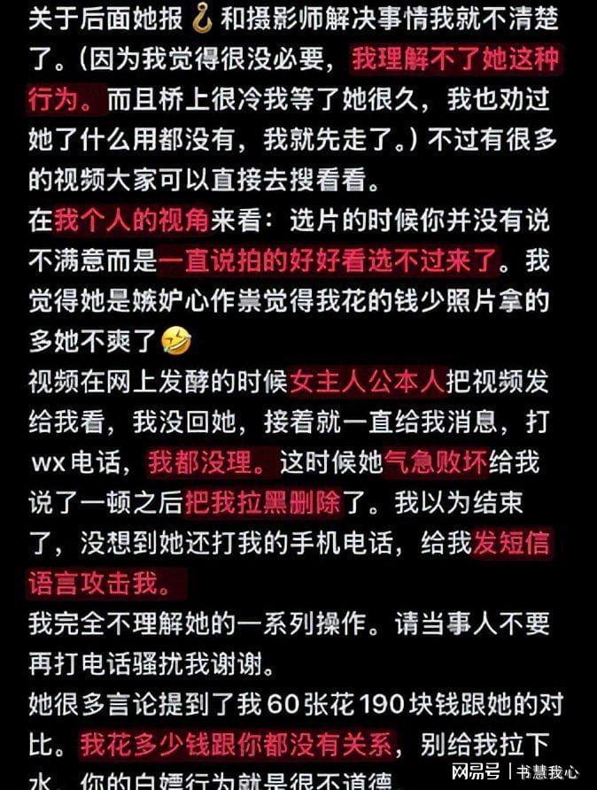 这位朋友澄清,她们俩当时找的根本不是同一个摄影师,所以女生所谓“朋友拍照更便宜”的退款理由,根本站不住脚。
