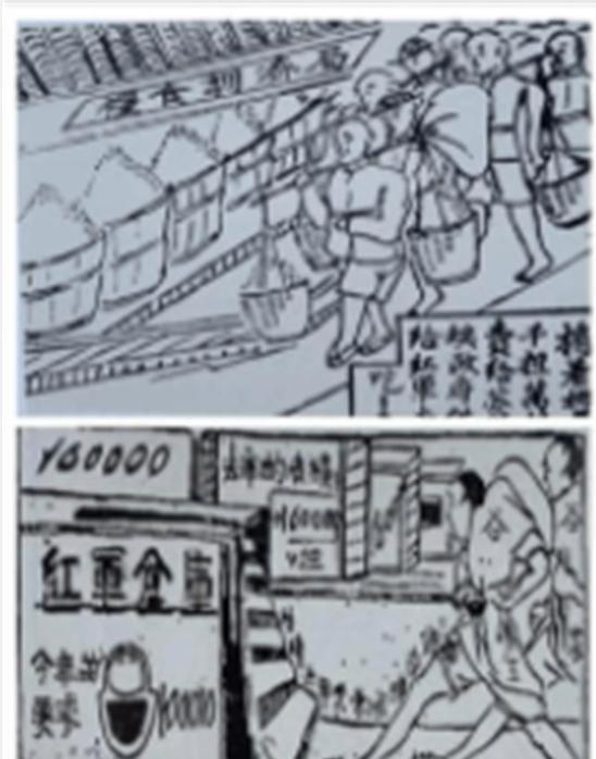 还有站立着身背步枪、神情刚毅的红军战士,显得格外精神,画面还配有文字,使用了非常口语化、大众化、乡土化的百姓语言,为群众所喜闻乐见。如:“穷人没有饭吃到土豪家里去挑谷”、“欢迎白军士兵的反水过来当红军”、“工人增加工资减少工作时间!”“只有分了田地,才有饭吃有衣穿!”等。