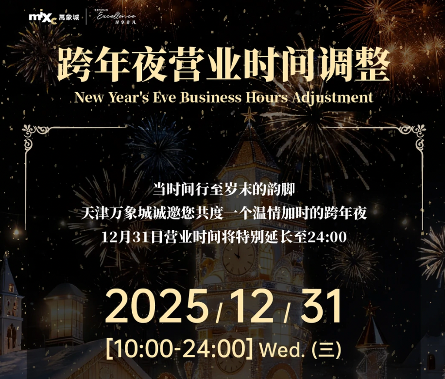 @天津万象城官方发布通告:跨年夜(2025年12月31日)当天营业时间延长至24:00,全天营业时间为10:00-24:00。