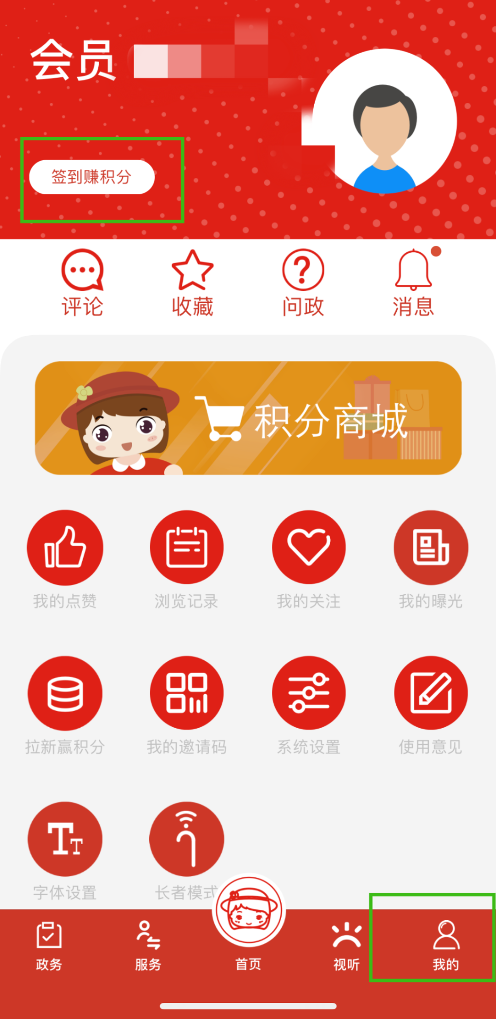 2、打开上海虹口APP,点击右下角“我的”,然后点击“签到赚积分”,进入积分领取界面