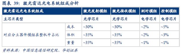 激光雷达收发模组成本占比最高,推动光学芯片及其配套元器件的集成化为主要降本方向。激光雷达光电系统成本约占激光雷达整机成本的70%,由激光发射、激光接收、测时、控制四大模块构成。激光收发模组成本在整机中占比近60%,体积、重量在整机中占比近70%(远高于测时模组和控制模组),核心部件为激光器和探测器。通过将分立光学芯片及其配套元器件高度集成,可大幅降低生产成本、快速扩充产能,随着激光雷达线数的增加,光学芯片集成化带来的优势会更加明显。