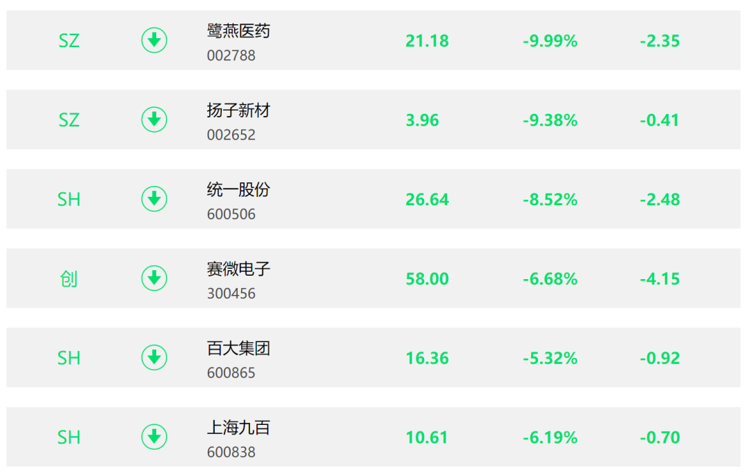 12月31日早盘,部分高位人气股跳水。截至10:03,鹭燕医药封跌停,扬子新材、统一股份、赛微电子、百大集团、上海九百等跟跌。