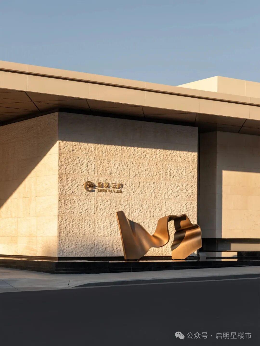 景墙选用的是贝金米黄和孔雀玉石材,质感温润,归家时让人倍感温馨。门前是特邀法国艺术家打造的雕塑,与镜面水景、迎宾树组合成一幅优美的画卷。