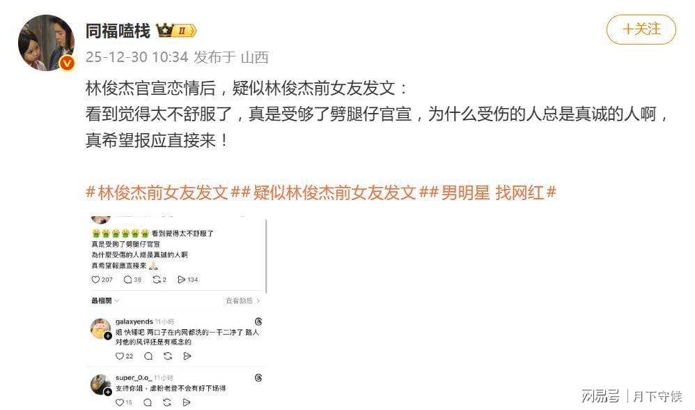据网友12月30日爆料,林俊杰借母亲寿宴高调官宣恋情的甜蜜劲儿还没散,一盆来自过往的“冷水”就泼上了热搜。一句“真是受够了劈腿仔官宣”,让一场围绕“劈腿”与“无缝衔接”的罗生门,瞬间成为舆论风暴眼。