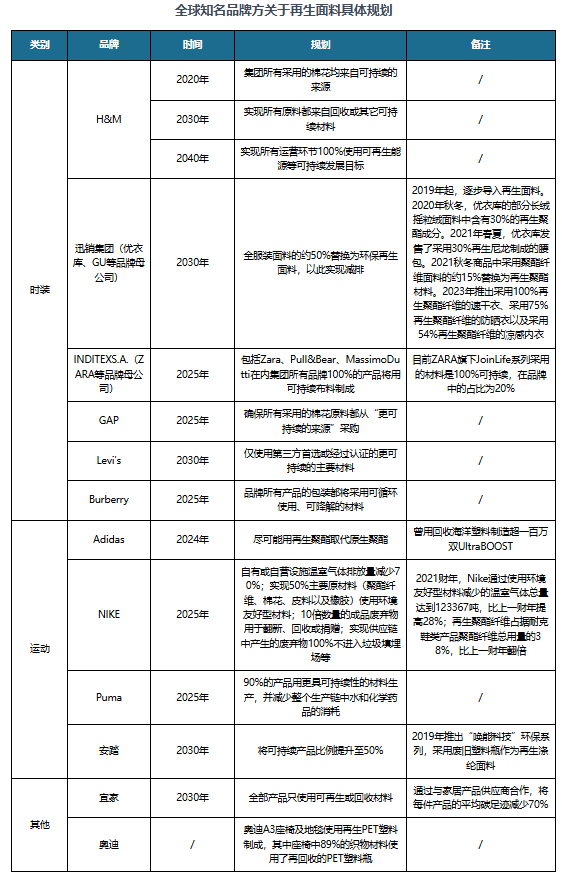 当下,服装品牌商作为产业链关键推动者,正将再生面料纳入战略核心:如国际品牌ZARA承诺到2025年实现100%使用再生面料,H&M、宜家承诺到2030年实现所有原料都来自回收或其它可持续材料,国内企业如安踏承诺到2030年实现50%使用再生面料。