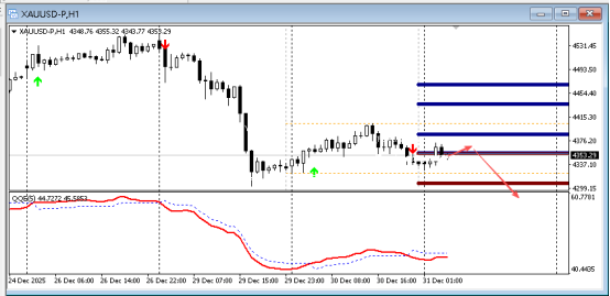 目前QE箭头向下,代表空头强劲,预示行情向下的概率大,故而可以采取高空的策略,可以在15分钟寻找做空信号,第一压力位置:4384。下方支撑4322