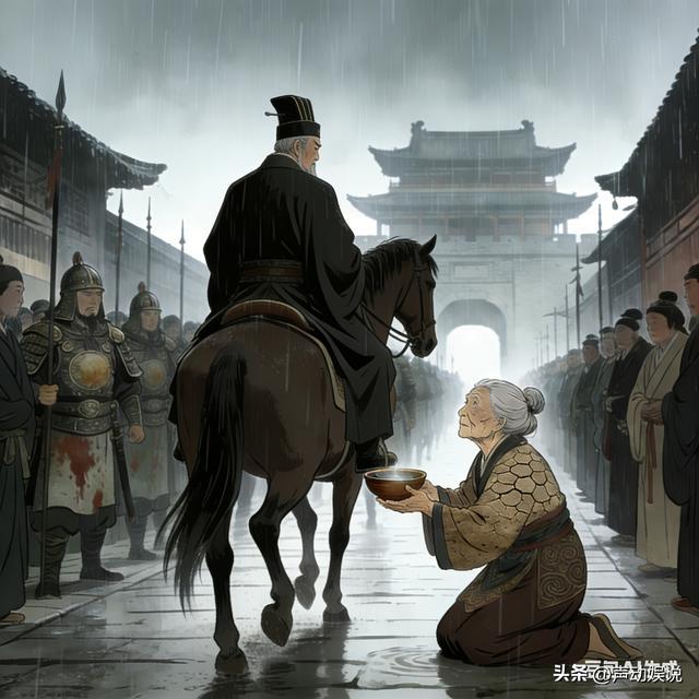 一个楚国老妪忽然从人群中冲出,跪在他的马前。她手里捧着一只破陶碗,碗里是浑浊的雨水。