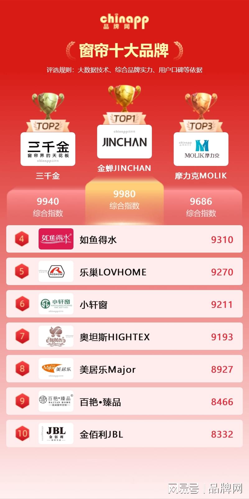 榜单说明:窗帘十大品牌数据由品牌网chinap品牌数据研究部门通过资料收集整理,品牌网chinap基于大数据统计、人为根据市场及参数条件变化的分析研究专业测评而得出,是大数据、云计算、数据统计真实客观呈现的结果。