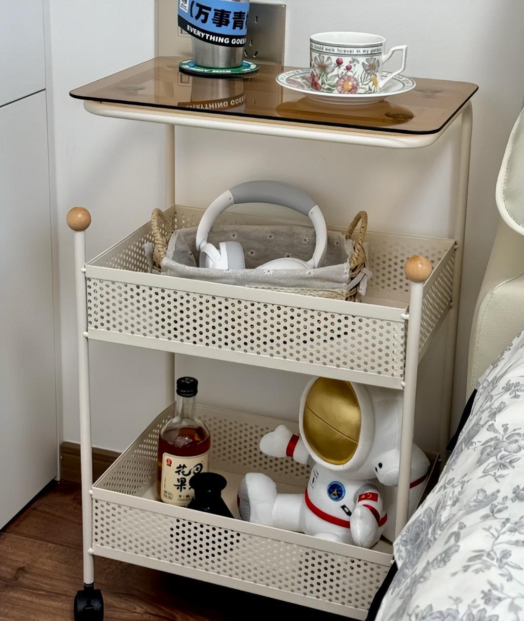 小边几都是有小轮子的设计,不占地方还好用,在网上你就能买到质量很不错的款式,等到晚上准备睡觉时,把小推车放在床边就行了。