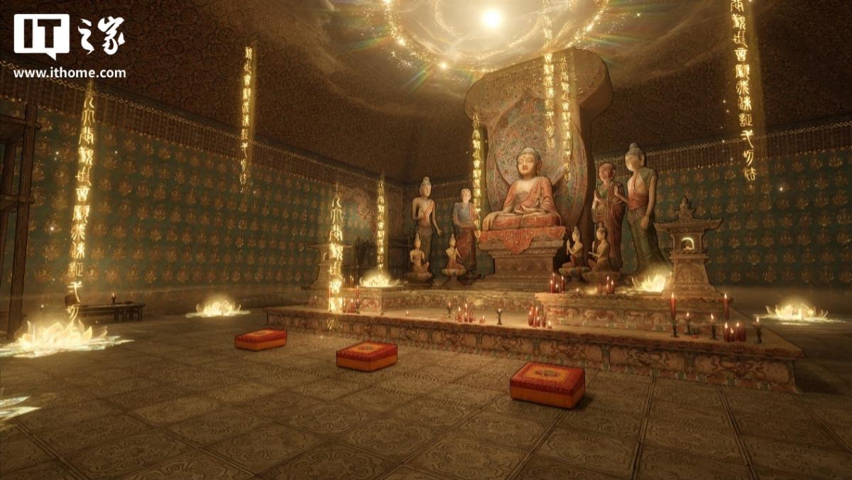 而当我们来到莫高窟内的大佛石像前,再次使用“冥想”技能,也会获得截然不同的视觉观感,仿佛虔诚的祷告被已经被佛看见,成佛大道又近了一步。