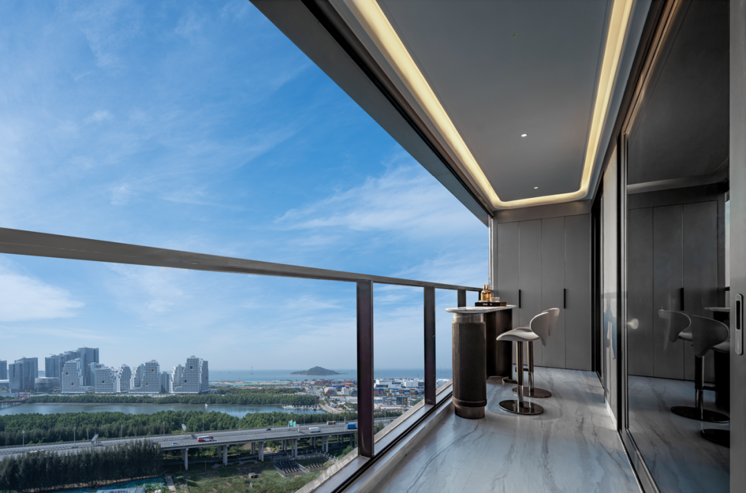 约7.5米的巨幕阳台,是南向望前海湾,视野非常开阔,在阳台摆个小桌子,和家人或好友品茗聊天,抬头就可就看到前海湾景观、企鹅岛。